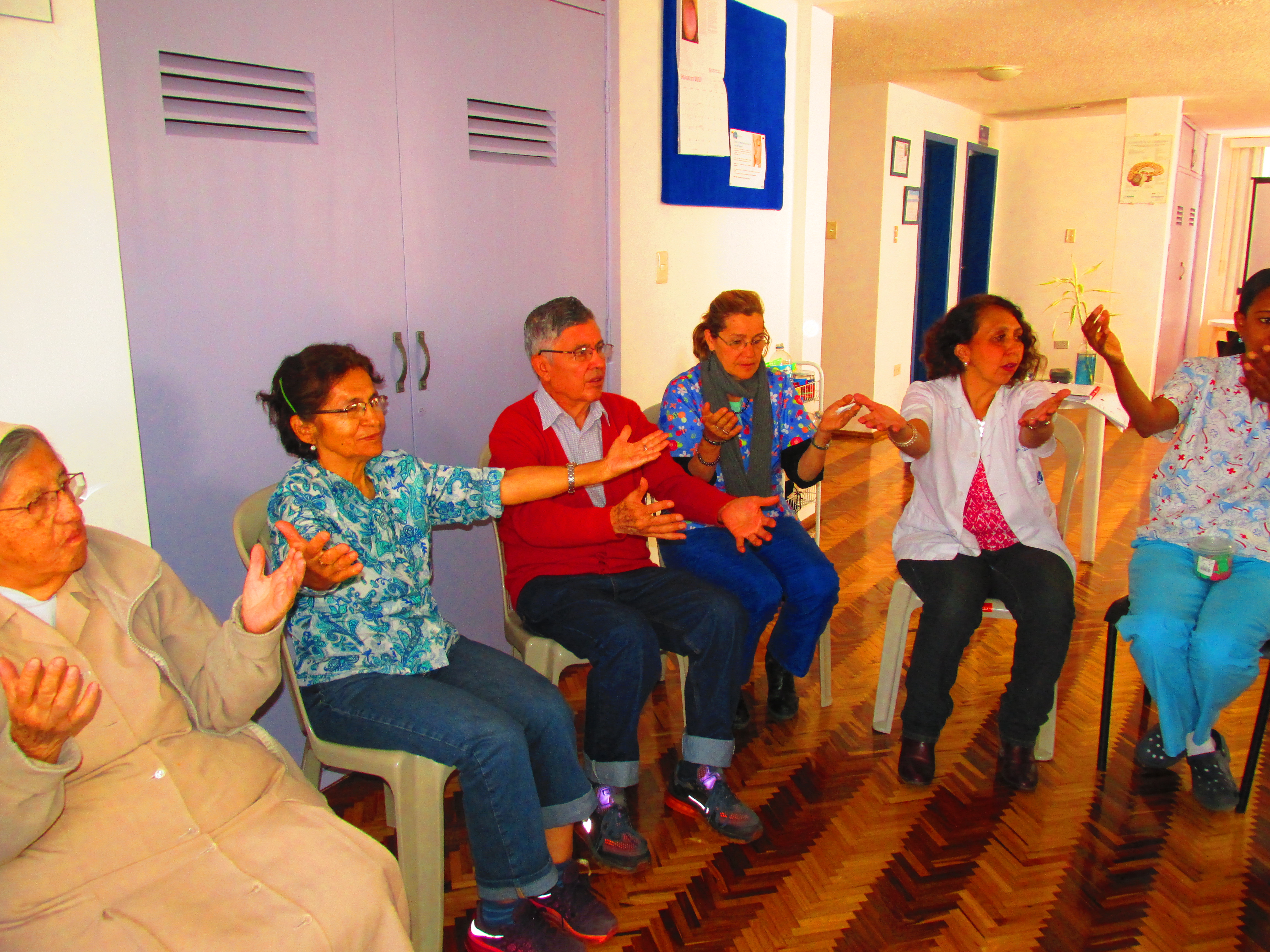 We gave two free demonstrations of Move with Balance® with Music at the Neuromedicenter in Quito, Ecuador. We worked with Alzheimer’s patients at a day care center. They were totally accepting of us. The couple who runs the day care center are very dedicated. They have a diagnostic room, a small “gym”, a sensory/motor room, and a gardening area for the clients.