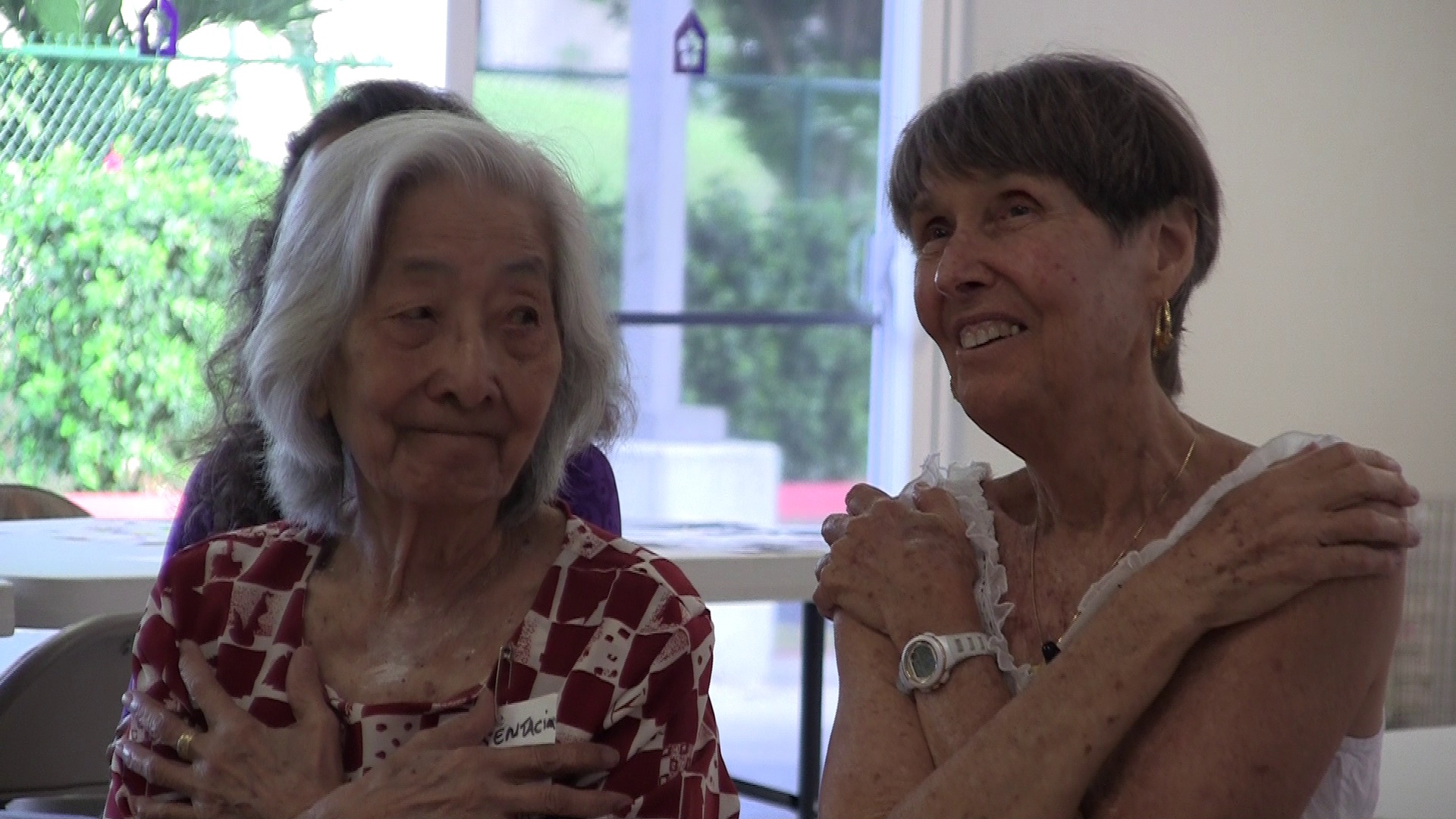 For this program, Move with Balance teamed with Maui Adult Day Care, to recruit 10 seniors who have Alzheimer’s or a related dementia and also recruited 10 loving and compassionate fit seniors to serve as their mentors. Each class begins with a 10-minute icebreaker. Mentees arrive and sit at a coloring table with their mentors participating in activities such as writing with both hands at the same time. This gives mentees a chance to connect with their mentors before heading into the classroom setting for the main program.